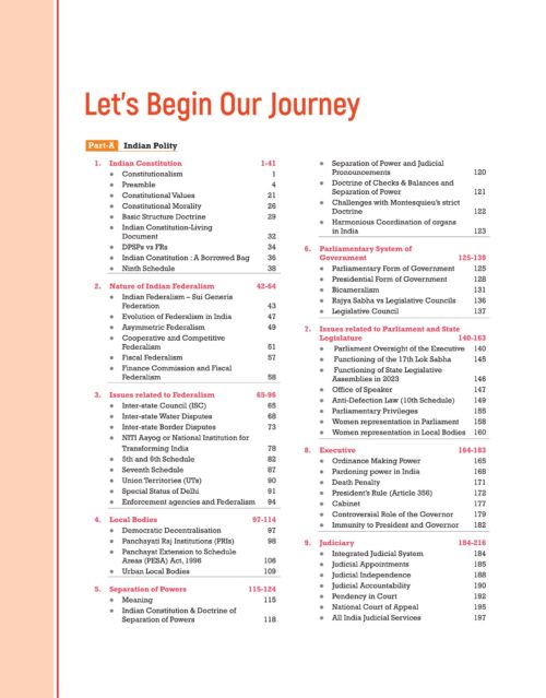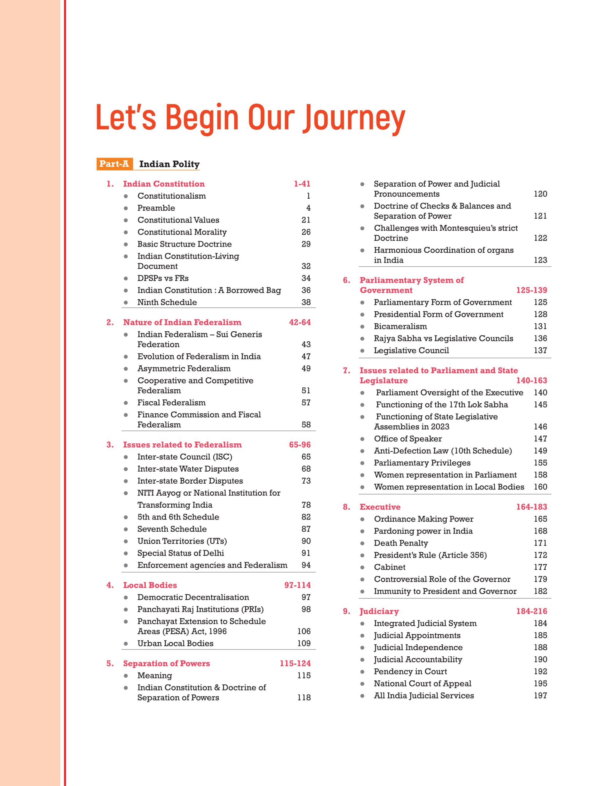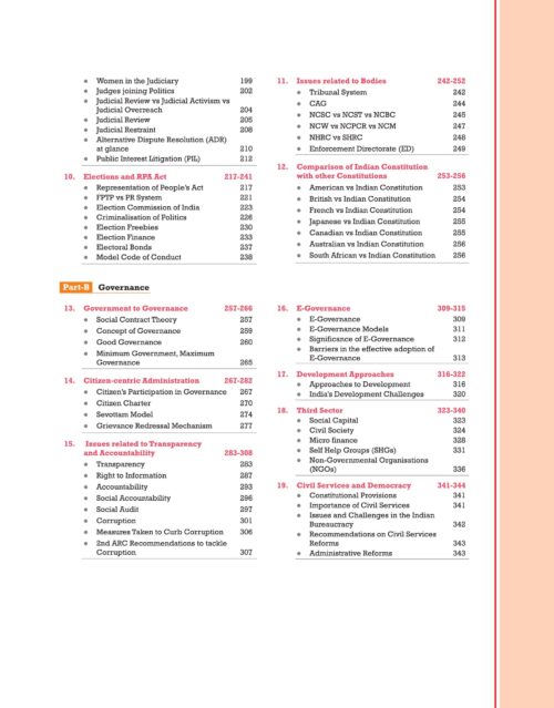 Table Of Content PART A: Indian Polity, PART B: Governance BOOK STRUCTURE Division of the book into 2 Parts: Indian Polity and Governance BOOK FEATURES Comprehensive and Exam-Oriented Content: Covering all the topics in detailed manner Content Enrichment: Inclusion of Current Examples, Data & Facts, Case Studies, and Supreme Court Judgements Innovative Exam-ready Frameworks: To enhance answer writing skills and feature PESTAL, Stakeholder, Life-cycle, etc. framework Visually appealing presentation: With Flowcharts, Timelines, Mind maps, Hand-drawn Diagrams, Tables, and Maps PYQs Integration: Each chapter end has PYQs that aligns the content with the recent exam trends Multiple Revision: Easy revise the entire syllabus and improve the Mains score