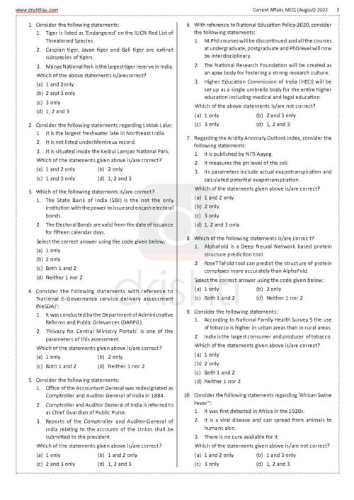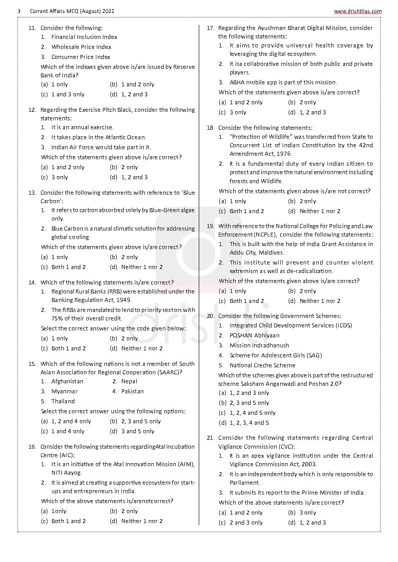 Drishti IAS Current Affairs MCQ Quiz Consolidation August Part I & II 2022 English Medium