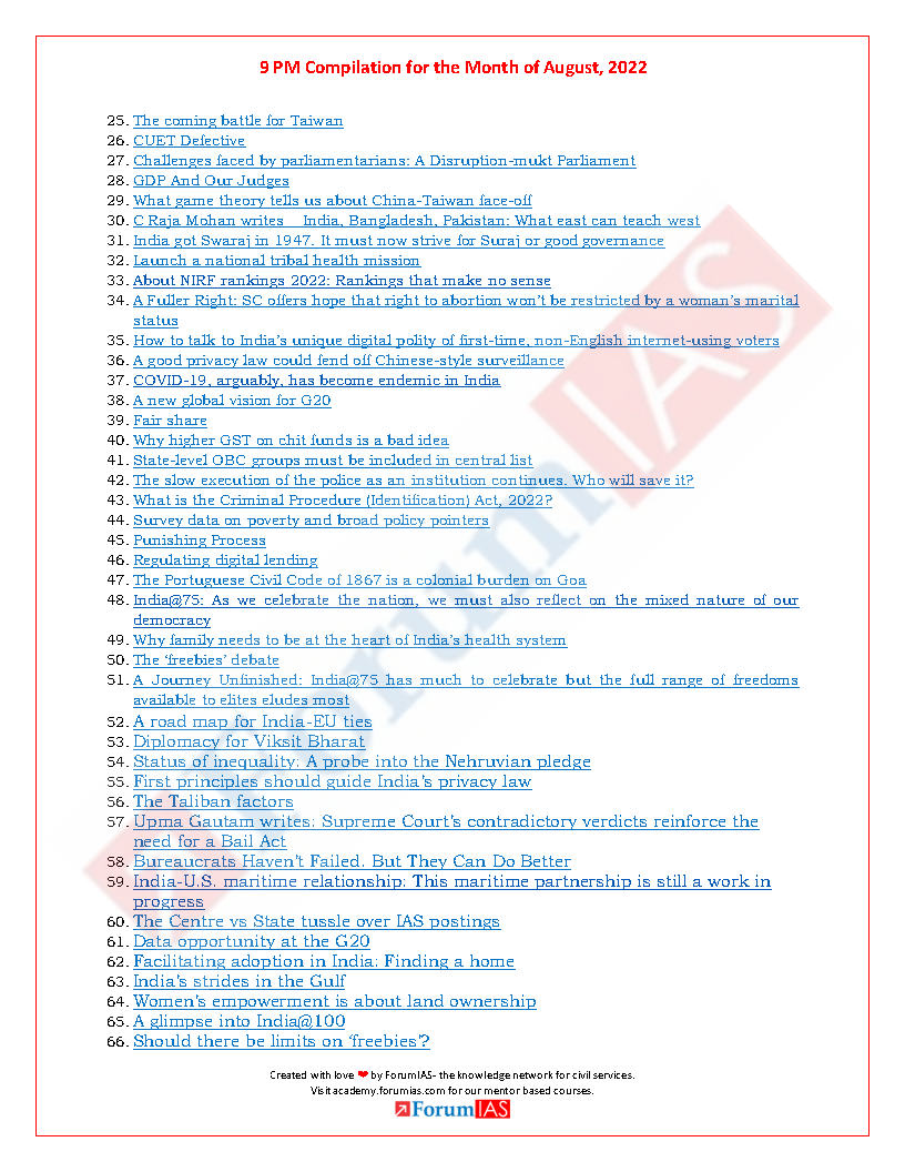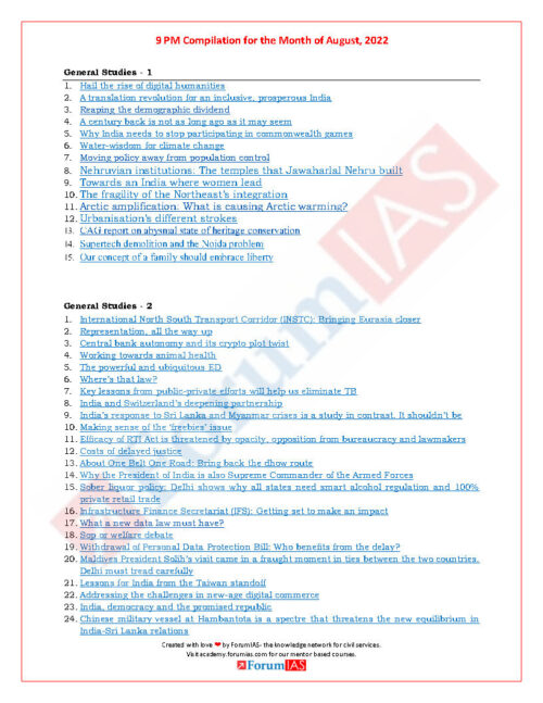 Forum IAS 9pm Compilation For The Month of August 2022 English Medium