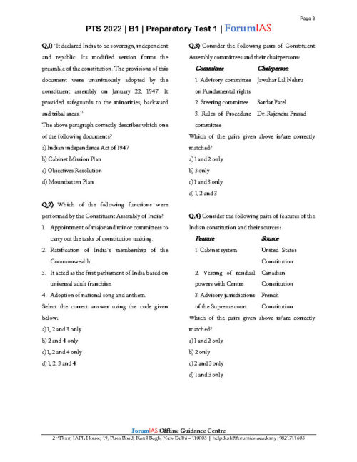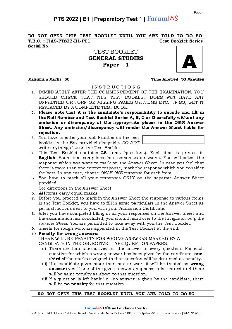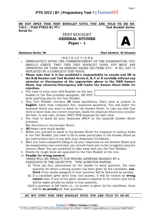 Forum Ias  General  Studies Prelims Preparatory Mini Test 2022 English Medium
