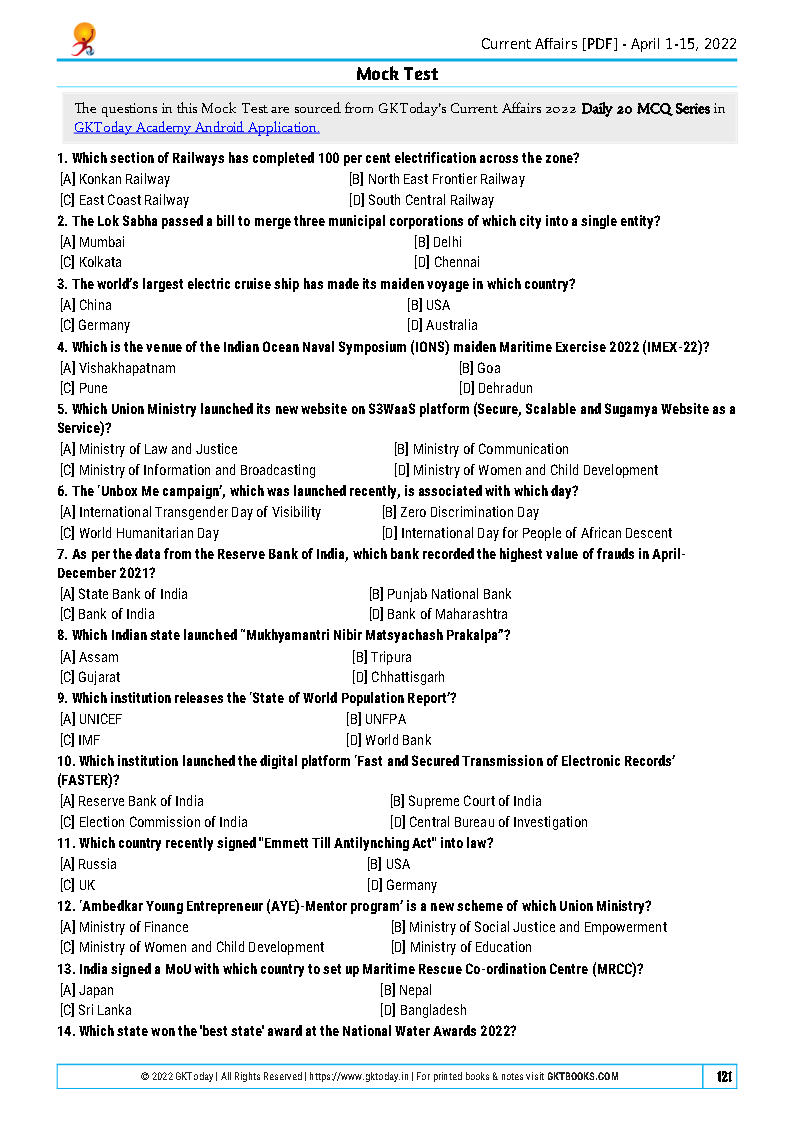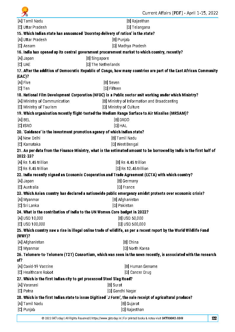 GK Today Current Affairs Monthly Quiz Compilation April English Medium 2022