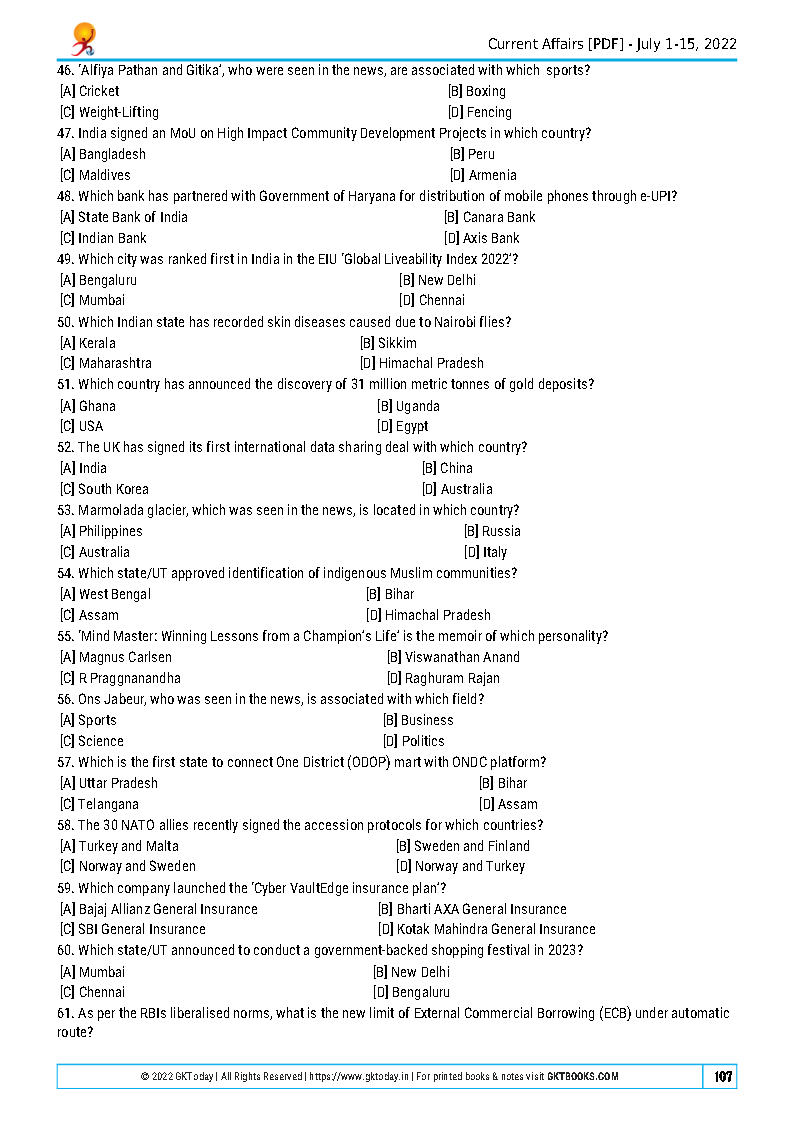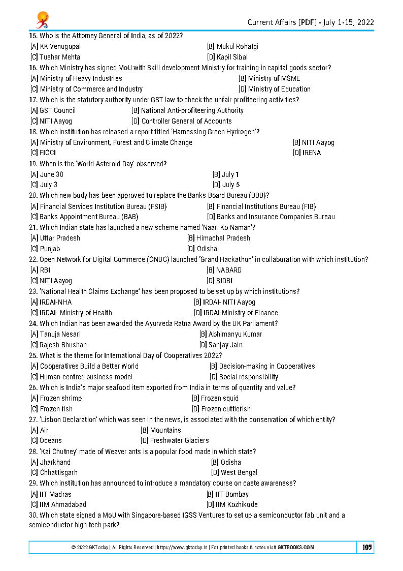 GK Today Current Affairs Monthly Quiz Compilation July English Medium 2022