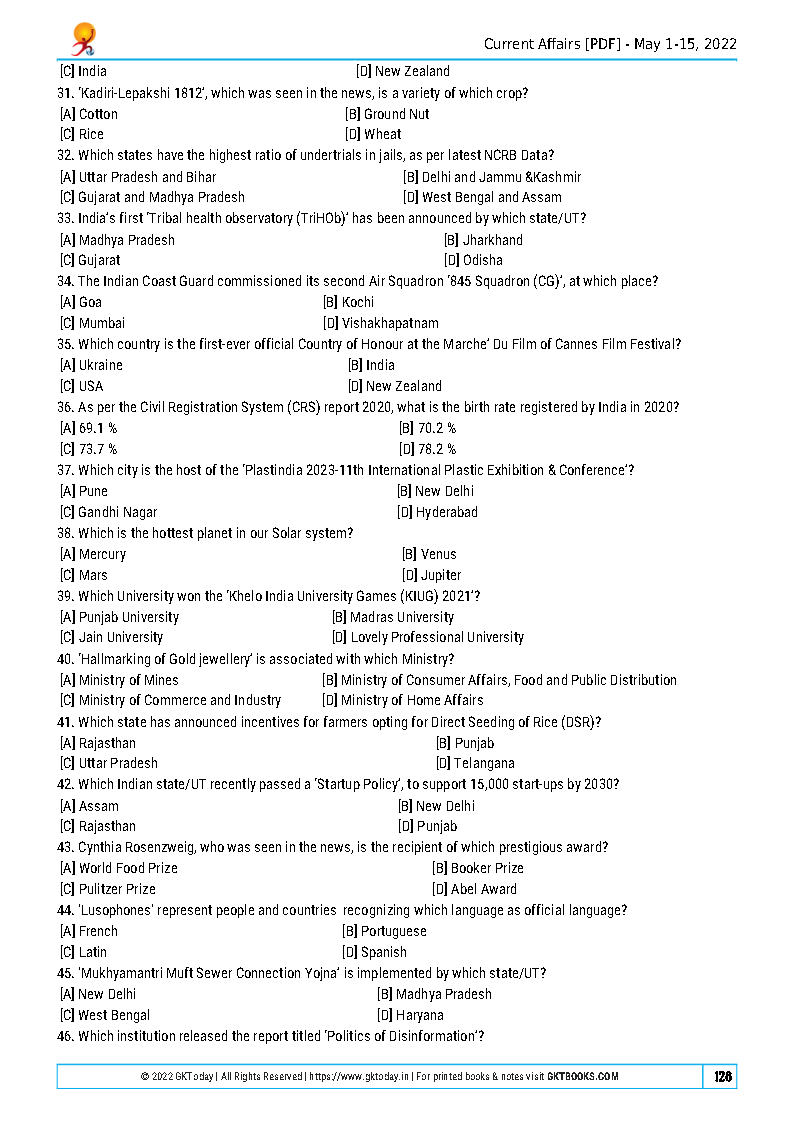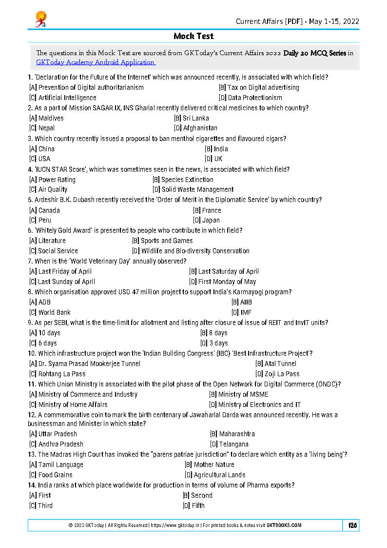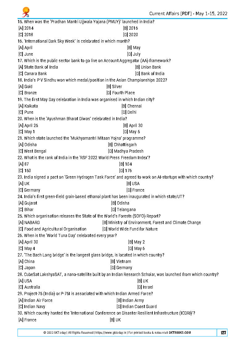 GK Today Current Affairs Monthly Quiz Compilation May English Medium 2022