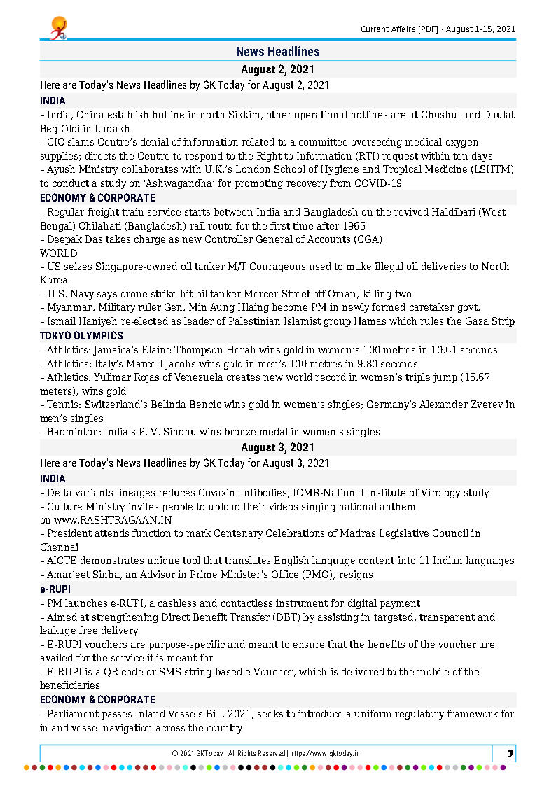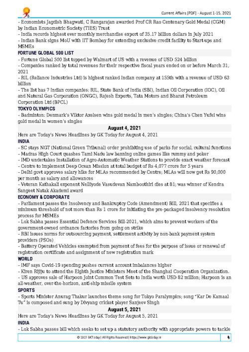 GK Today Monthly Current Affair August 2021 Printed Notes English Medium