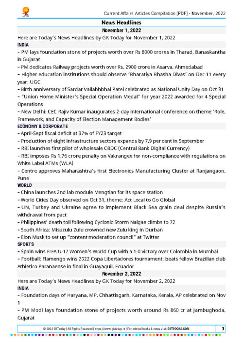 GK Today Current Affairs Monthly Quiz Compilation November English Medium 2022