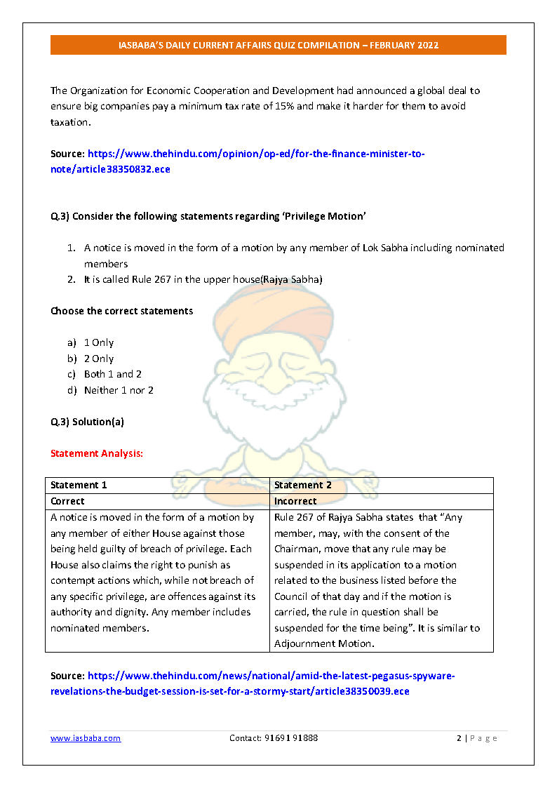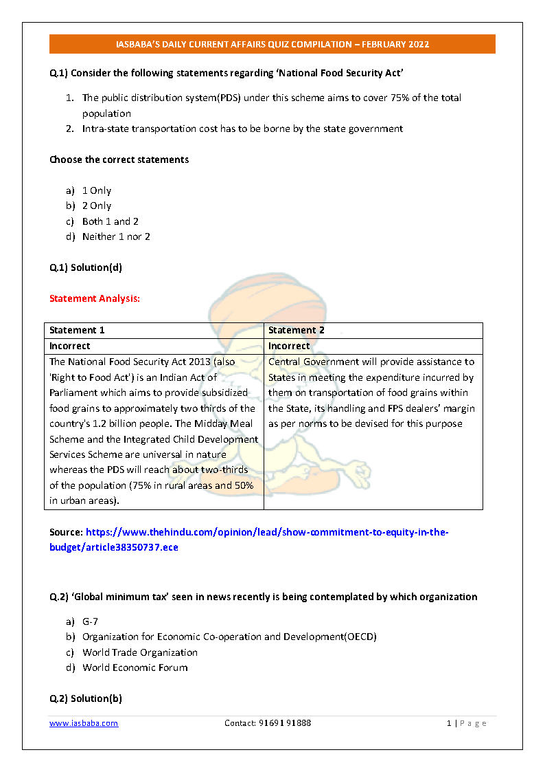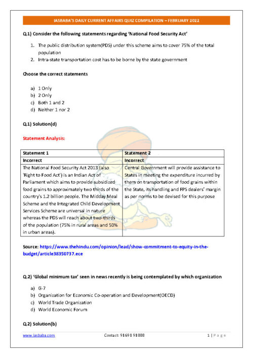 IAS Baba’s Daily Current Affairs Quiz Compilation UPSC February 2022 English Medium