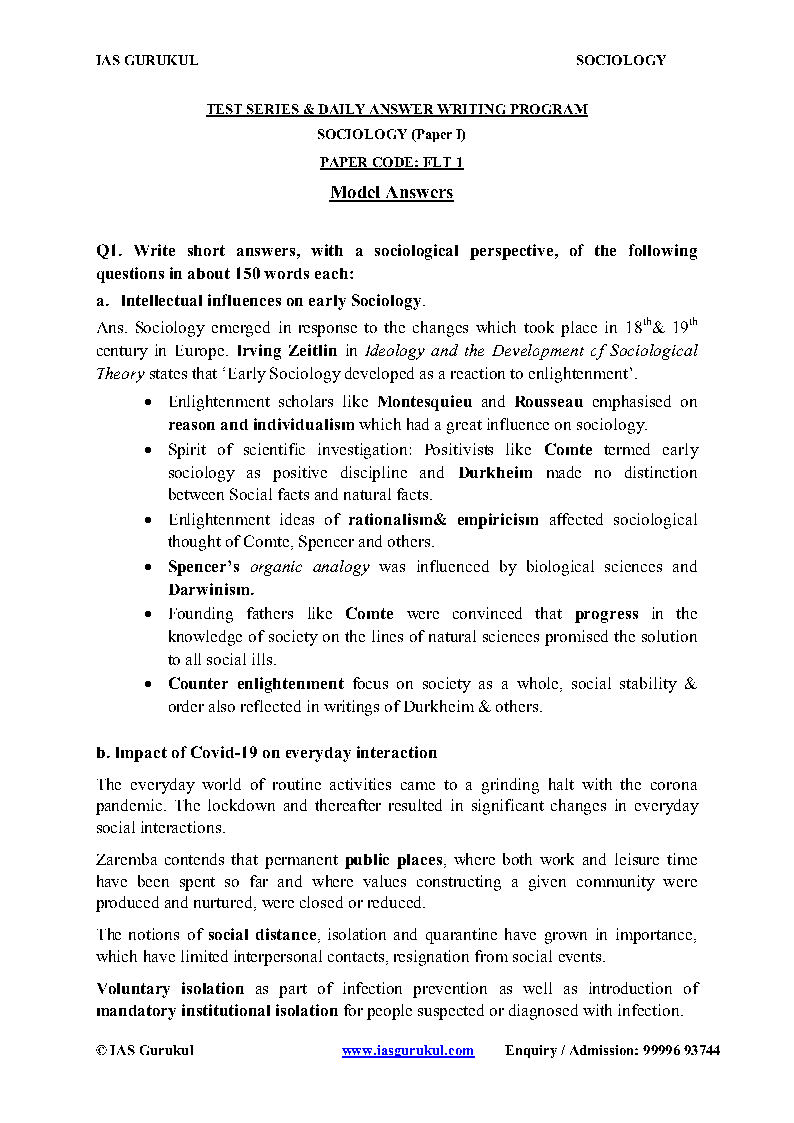 Ias Gurukul Sociology Optional Test Series FLT 01 To 08 Model Answers Writing 2022 English Medium