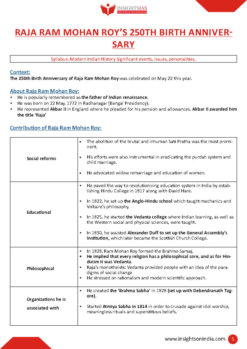 • Raja Ram Mohan Roy’s 250th birth anniversary