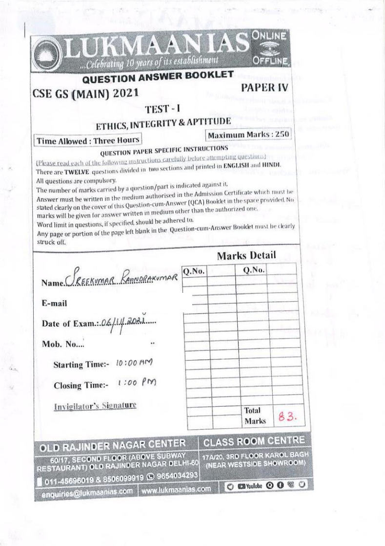 lukmaan Ias Ethics Topper’s copy 2021 English Medium Ethics Sreekumar Ravindra Kumar (Air – 192)