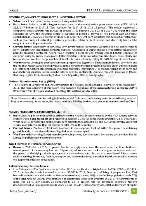 Only aar GS Paper-III Indian Economy SummaryIAS Prah English Medium 2021