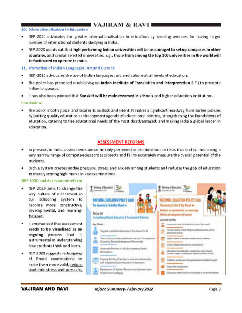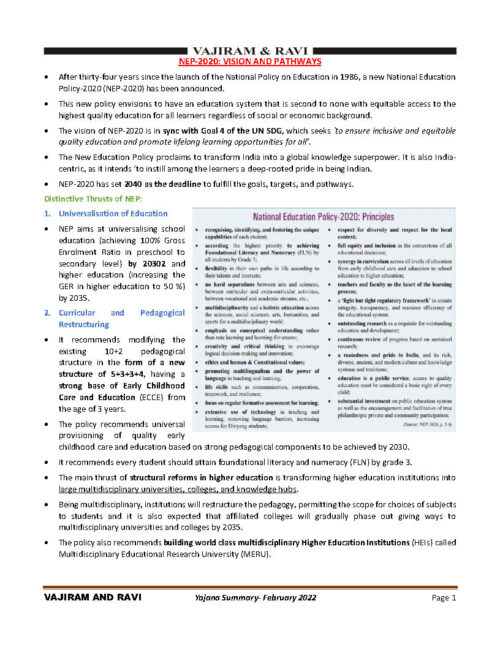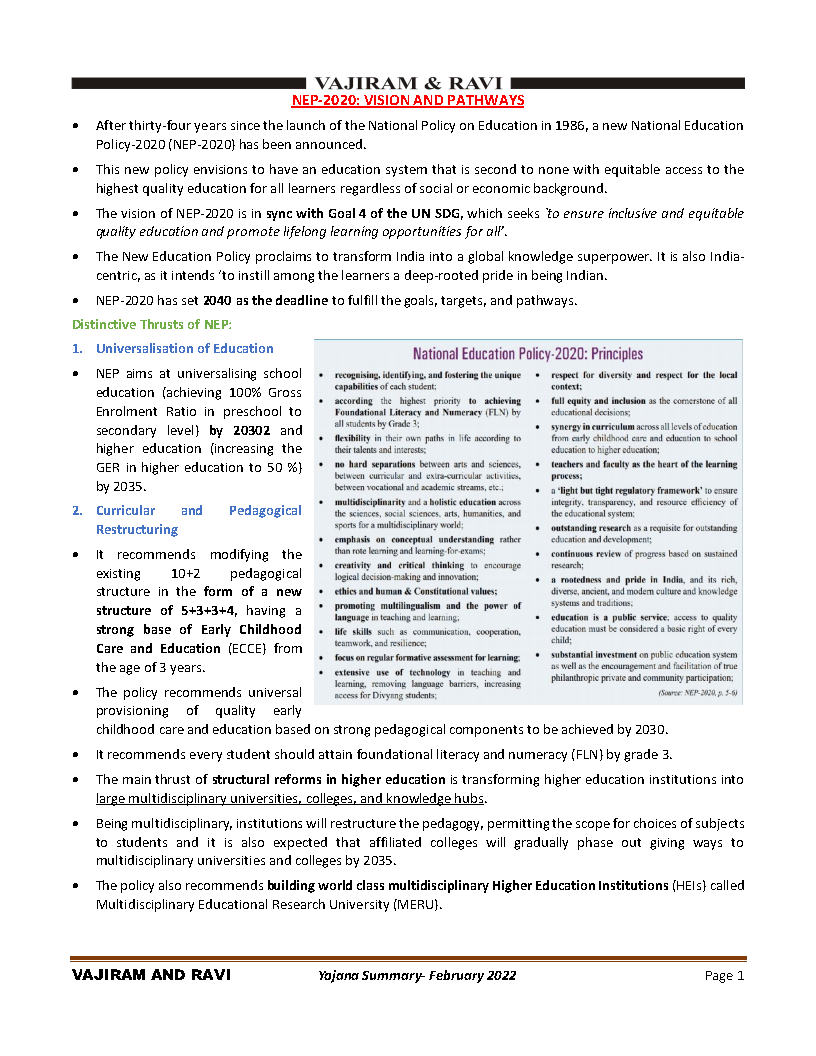 Vajiram & Ravi Monthly Yojana Summary (National Education Policy-2020) February 2022 Printed Notes English Medium